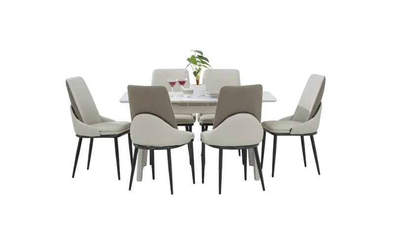 Elevate your dining experience with the Royaloak Johor Malaysian Glass Extendable Dining Table paired with the Royaloak Phoenix American Dining Chair Set, a premium dining table and chair combination designed for style, comfort, and practicality. The dining table features a tempered glass surface, push-and-pull mechanism, solid wood frame, and high-gloss finish legs for durability and contemporary appeal. The extendable table can easily accommodate guests, by converting from 4 seater to 6 seater easily. The leatherette chair offers a high backrest, plush cushioning, curved back profile, and powder-coated metal legs, delivering both comfort and elegance. Perfectly crafted, this set enhances modern interiors as a sophisticated piece of dining room furniture.